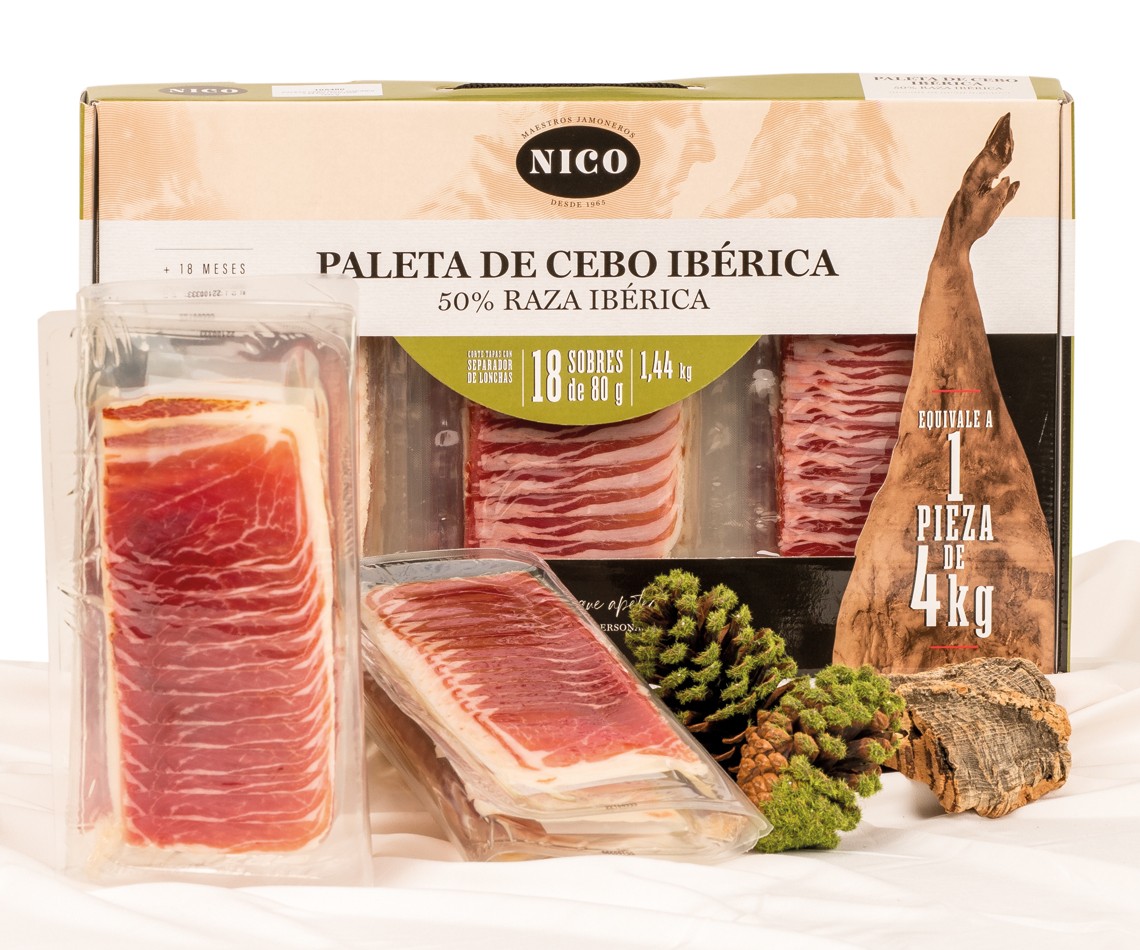 1 Est. paleta de cebo 50% Ibérica NICO JAMONES 18 sobres x 80 g (1,44 Kg aprox)