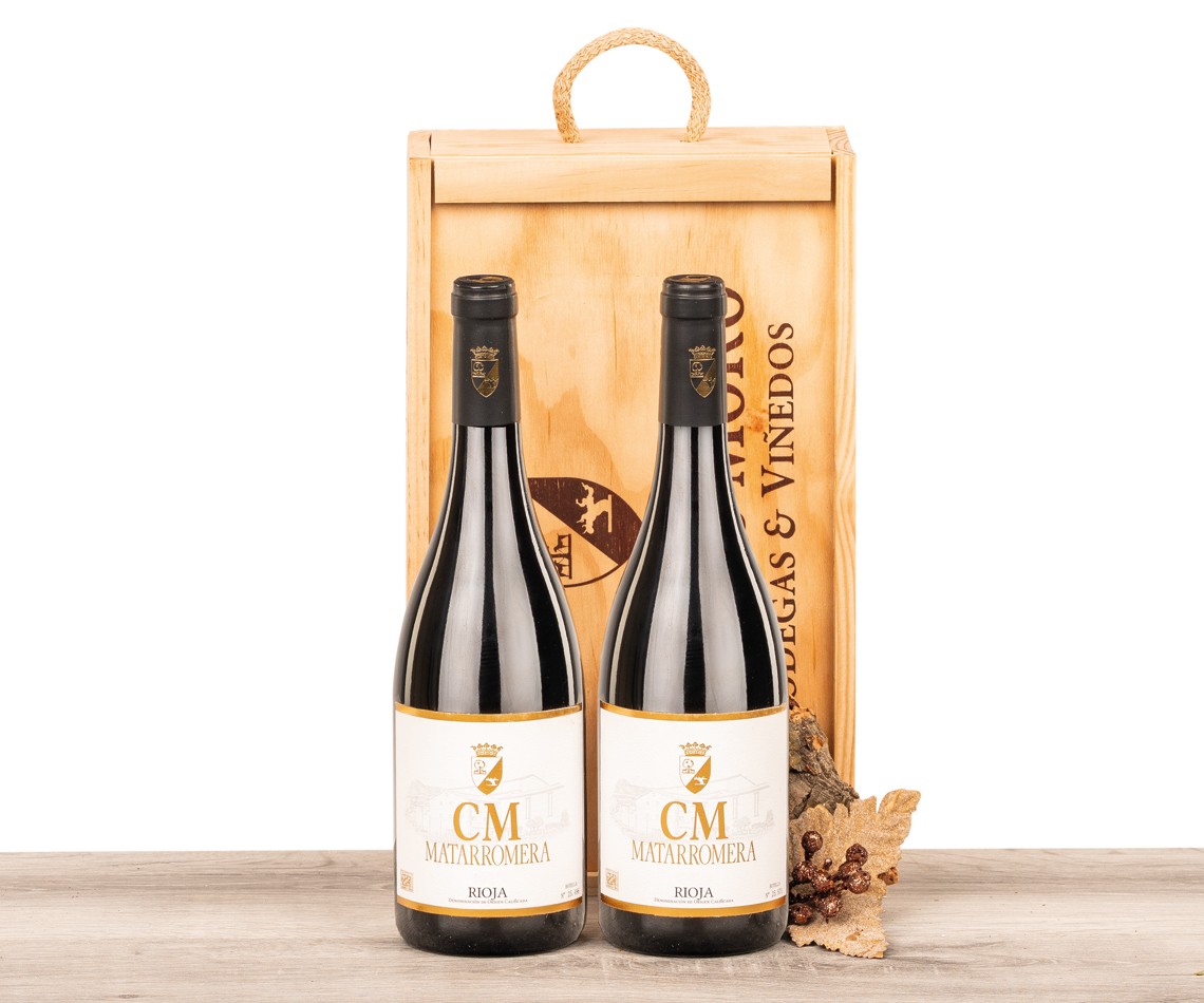 1 Caja madera 2 botellas de vino D.O. Rioja " CM " Matarromera
