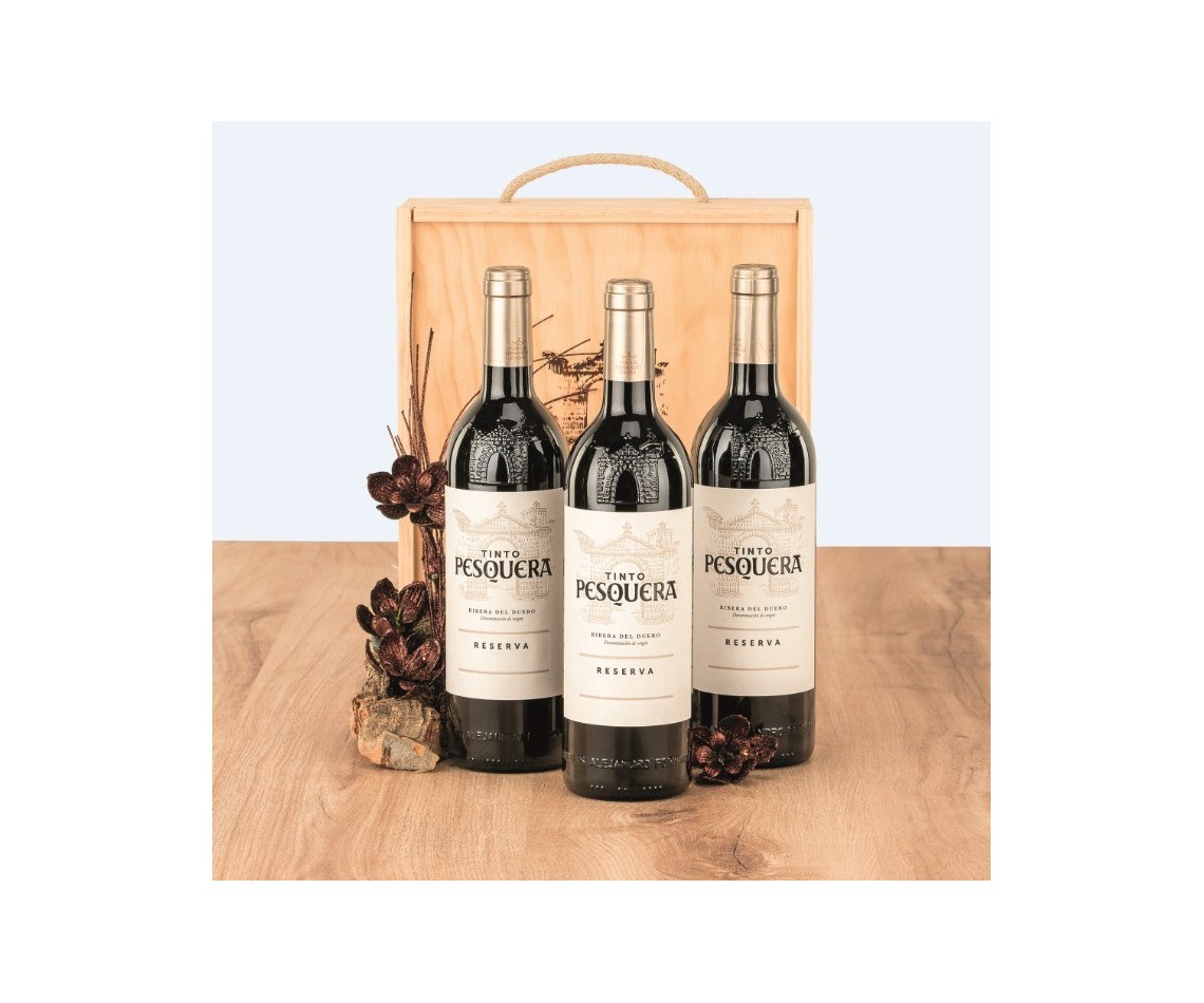 1 Caja madera 3 botellas de vino D.O. Ribera del Duero PESQUERA reserva