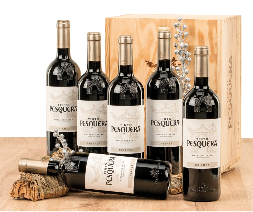 1 Caja madera 6 botellas de vino D.O. Ribera del Duero PESQUERA crianza