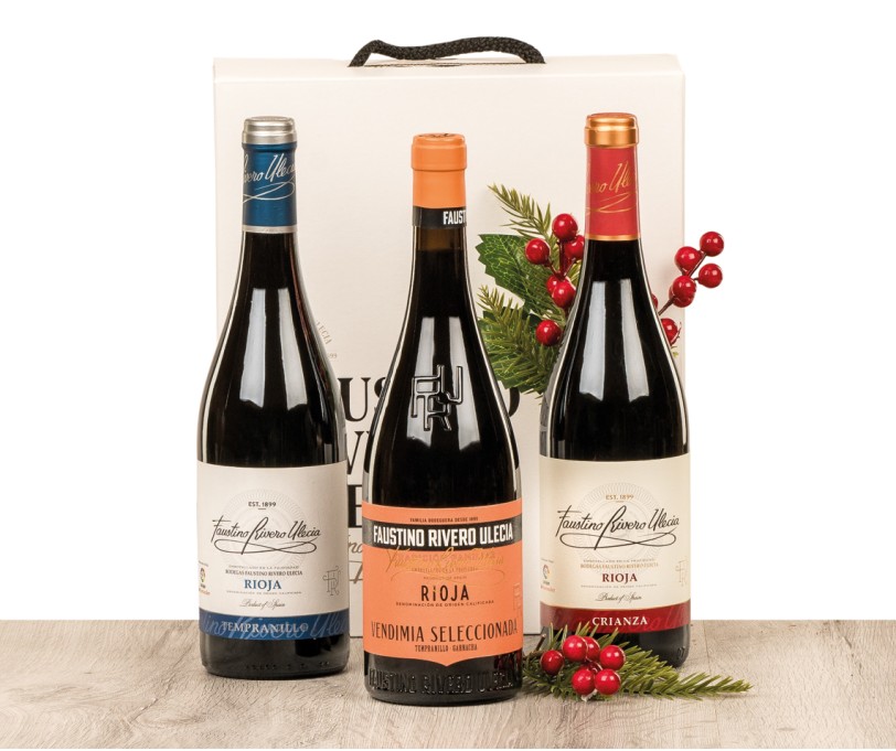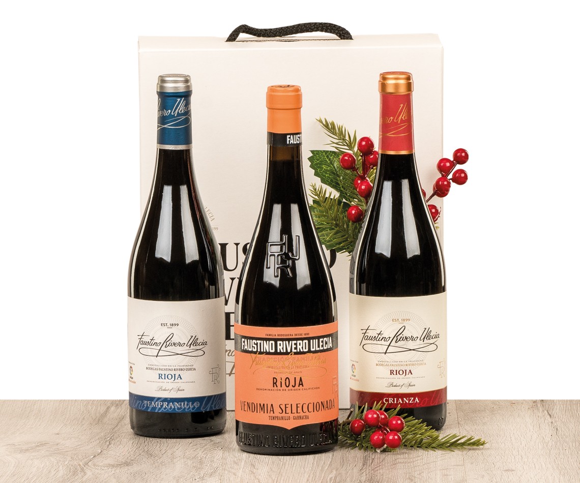 1 Estuche de 3 botellas de vino D.O. Rioja FAUSTINO RIVERO (1joven +1 crianza + 1 vend. seleCaja)
